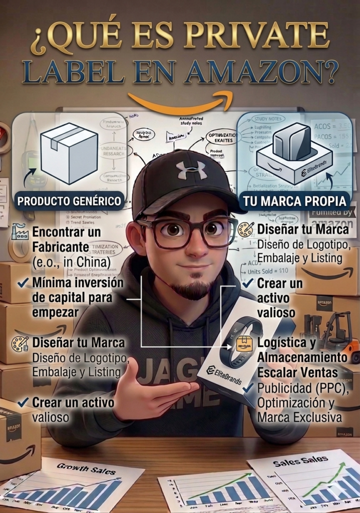 El curso AMZN Elite enseña a vender en Amazon usando el modelo de marca propia (Private Label). Básicamente, eliges un producto que ya existe, le pones tu marca, lo mandas a fabricar (normalmente en China) y lo vendes en Amazon como si fuera tuyo.
